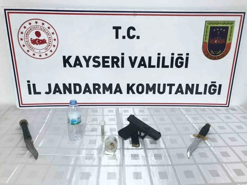 Kayseri İl Jandarma Komutanlığı İstihbarat Şube Müdürlüğü ve Kocasinan İlçe Jandarma Komutanlığı tarafından istihbari çalışma başlatıldı. Yapılan çalışmalar sonucunda şüpheli A.T.’nin ikametinde yapılan aramalarda 10 gram uyuşturucu madde, 1 adet tabanca, 1 adet şarjör, 2 adet mermi, 2 adet kasatura ve uyuşturucu madde kullanma aparatı bulundu.
