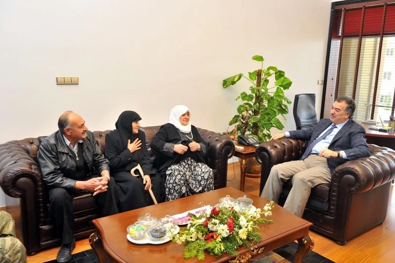Osmaniye Valisi Kerem Al`ın, Cevdetiye Konaklama Merkezi ziyareti sırasında makamına davet ettiği Suriyeli Emine Hacıoğlu, komşusu ve torunu ile birlikte ziyarette bulundu. 85 yaşındaki Emine Teyze, Vali Kerem Al?ın Konaklama Merkezi ziyaretinin sonunda, Vali Al ile bir süre sohbet etmiş ve kendilerine bu imkânı sağlayan Türkiye Cumhuriyetine teşekkür etmişti.Emine Hacıoğlu`nu kapıda karşılayan Vali Kerem Al, ziyaretten memnuniyet duyduğunu ifade ederek, ?Emine Teyzemizle Osmaniye Konaklama Merkezi ziyaretimiz sırasında tanışmış bir süre sohbet etmiştik. Ne zaman isterse kendisine kapımız açık olduğu ifade etmiş ve herhangi bir sorunu olursa yardımcı olacağımızı belirtmiştik. Bugün bizim misafirimiz oldu, bizi mutlu etti" diye konuştu.Emine Hacıoğlu ise kendilerine barınma imkânı sağladıkları için Vali Kerem Al`a teşekkür ederek, "Biz sizden razıyız, Allah da sizden razı olsun. Bize kucak açtınız, Allah bu ülkeyi korusun" diye konuştu.İl Jandarma Komutanı Jandarma Albay Tayfun Dündar ve İl Emniyet Müdürü Nurettin Gökduman`ın da bulunduğu ziyaretin devamında misafirleri ile bir süre sohbet eden Vali Kerem Al, ziyaret sonunda konuklarına hediyeler verdi.