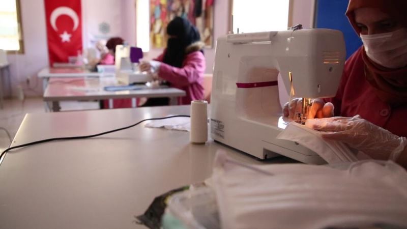 Yetim Vakfi Reyhanli Egitim Köyü bünyesindeki tekstil ve tasarim atölyesinde çalisan 10 Suriyeli yetim annesi ve iki personel, bir haftada 6 bin 400 maske üretimi yapti.