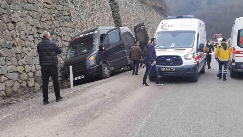 Zonguldak-Ankara karayolunda yolcu minibüsü kaza yaptı. Direksiyon başında kalp krizi geçiren şoförle beraber 12 kişi yaralandı.