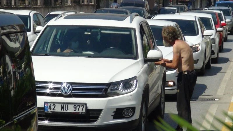 Manavgat ilçesinde sürekli alkol alarak trafik ışıklarında bekleyen araçlara yaklaşarak sürücülerden para isteyen yaşlı adam sürücüleri de çileden çıkardı.