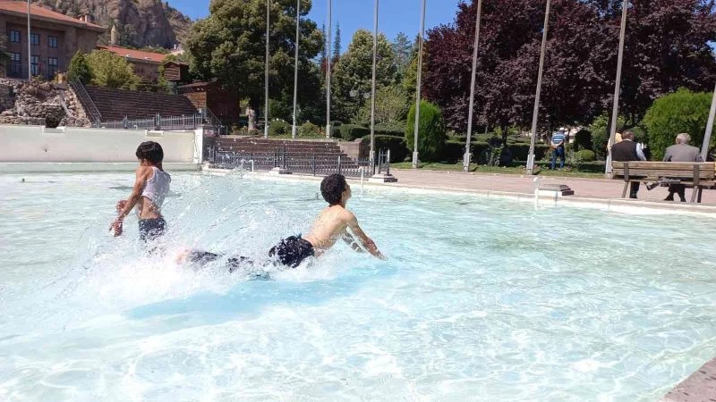 Sıcak yaz aylarında serinlemek için süs havuzlarını tercih eden Afyonkarahisar’daki çocuklar, sonbaharda da güneşi görür görmez kendilerini yine havuza bıraktılar.