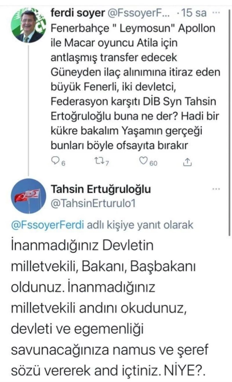 Ferdi Sabit Soyer, Fenerbahçe’nin transferi ile ilgili, "Fenerbahçe, Apollon’un Macar oyuncusu Attila için anlaşmış, transfer edecek. Güney’den ilaç alınımına itiraz eden büyük Fenerli, iki devletçi, federasyon karşıtı Dışişleri Bakanı Sayın Tahsin Ertuğruloğlu buna ne der. Hadi bir kükre bakalım. Yaşamın gerçeği bunları böyle ofsaytta bırakır" paylaşım yaptı.