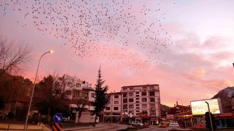 Eskişehir’in Sivrihisar ilçesinde gökyüzünü kızıla boyayan gün batımı manzarasını adeta dans ederek süsleyen sığırcık sürüsü, seyrine doyumsuz görüntüler oluşturdu.