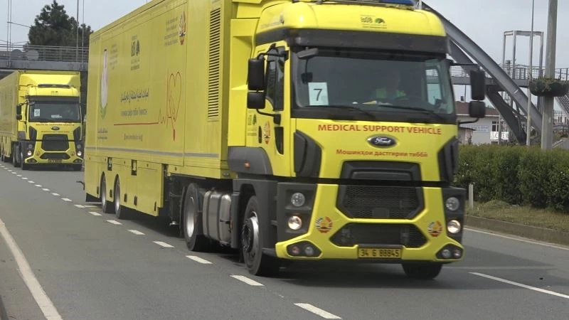 İslami Kalkınma Bankası (Islamic Development Bank IsDB) logosu bulunan medikal yardım tırları, Karadeniz Sahil Yolu ve Sarp Sınır Kapısı üzerinden Tacikistan’a gidiyor.