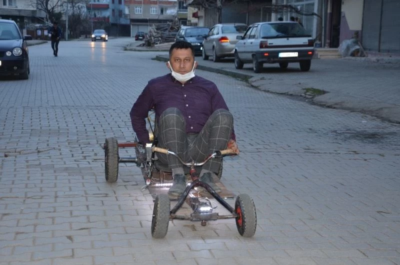 Ordu’nun Ünye ilçesinde yaşayan 42 yaşındaki Hüseyin Gümüş, 4 tekerlekli tahta arabaya taktığı motorla sürücülere rakip oldu.