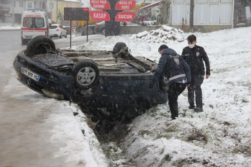 Takla atan araçta sıkışan sürücüyü itfaiye kurtardı
