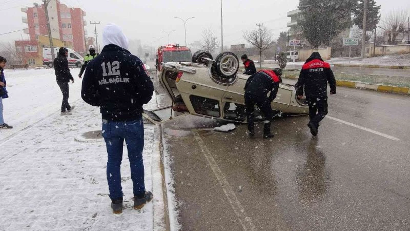 Adıyaman’da, kar yağışı nedeniyle kayganlaşan yolda kontrolden çıkan otomobil takla attı.