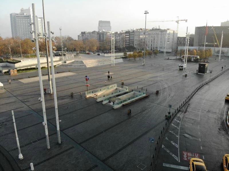 Korona virüs salgınının önlenmesi tedbirleri kapsamında dün akşam 21.00’de başlayan sokağa çıkma kısıtlaması nedeniyle Taksim Meydanı ve İstiklal Caddesi boş kaldı. Meydan, kısıtlamadan muaf olan turistler ile işe gidenlere kaldı. Taksim havadan görüntülendi.