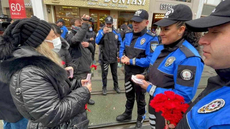 Taksim’de İstanbul Emniyet Müdürlüğü’ne bağlı Toplum Destekli Polislik Şube Müdürlüğü personelleri, 8 Mart Dünya Kadınlar Günü dolayısıyla kadınlara karanfil dağıttı, KADES uygulamasını tanıttı.