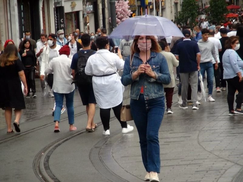 Taksim’de aniden başlayan yağmur vatandaşları hazırlıksız yakaladı. Yağmura aldırış etmeyen vatandaşlar sosyal mesafeyi hiçe sayarak İstiklal Caddesi’nde yoğunluk oluşturdu. Kimi vatandaşlar yanlarındaki şemsiyeleri açarken, kimi vatandaşlar ise ceketlerini kafalarına kapatarak önlem aldı.