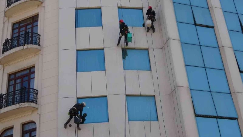 Yaptıkları işin zorluğuna karşı yoğun güvenlik önlemleri aldıklarını kaydeden temizlik işçisi Ersin Kuriş, “Aslında tehlikeli bir işimiz var ama güvenlik önlemlerini gayet iyi bir şekilde alıyoruz. İki tane ipimiz var. Bir tanesi ana ipimiz diğeri yardımcı ipimiz. Yukarıda kendimizi güvenli bir şekilde bir noktaya bağlıyoruz. Bir iniş aletimiz de var. Yukarı çıkmak için de ayrı bir aletimiz var, ondan destek alıyoruz. Yedek ipimize bağlı olan parçamız da var. Kendimizi sabitledikten sonra da vantuz adlı bir ekipmanımız var. İşimizi kolaylaştırmak adına onu kullanıyoruz. Dünya standartlarında bir kemerimiz de var. Özel ölçülere ait bir kemer bu. Bir oturağımız var, işimizi çok kolaylaştırıyor. Bizim için en önemli malzemelerden biri de bu. Son olarak bir kaskımız var. Yukarıdan herhangi bir malzemenin başımıza düşmesine karşı bizi koruyor. Daha önce herhangi bir tehlike yaşamadım. Çünkü güvenlik önlemlerimizi hat safhada alıyoruz. Yaptığımız iş gerçekten zorlu bir iş. O yüzden güvenlik önlemlerini en üst seviyede alıyoruz” diye konuştu.