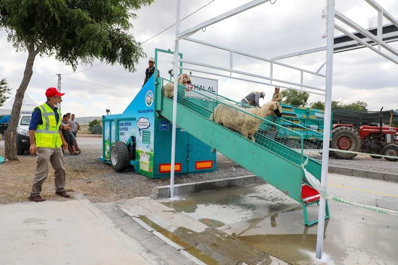 Talas Belediyesi kurduğu koyun yıkama banyoluğu ile satışa sunulan tüm koyunları ücretsiz yıkayıp dezenfekte ediyor.