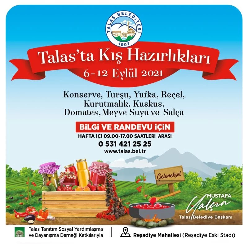 Reşadiye Mahallesinde bulunan eski stadyum içerisinde oluşturulan alanda gerçekleştirilecek organizasyonda ev hanımları salçadan turşuya, meyve suyundan konserveye, reçelden kuskusa kadar pek çok ürünü hazırlama imkanı bulacak. Talas Tanıtım Sosyal Yardımlaşma ve Dayanışma Derneği’nin katkılarıyla gerçekleşecek olan organizasyonla ilgili bilgi ve randevu almak isteyenler hafta içi 9.00-17.00 saatleri arasında 0541 421 2525 numaralı telefonu arayabilecekler