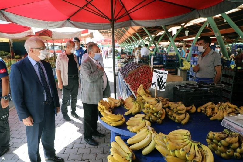 Talas Kaymakamı Yaşar Dönmez ve Belediye Başkanı Mustafa Yalçın birlikte gezerek başta pazar yeri olmak üzere sirkülasyonun yoğun olduğu yerlerde Maske, Mesafe ve Temizlik uyarısında bulundu.