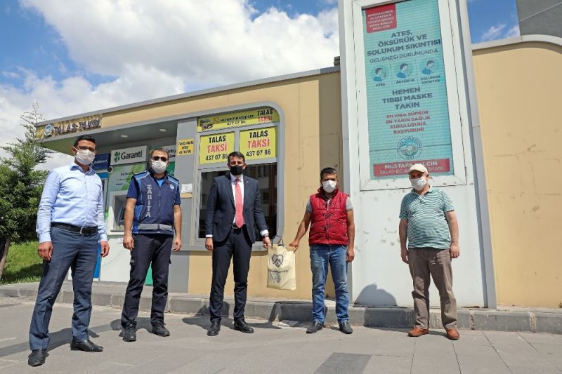 Yeni tip korona virüsle (Covid-19) mücadele çalışmalarını hız kesmeden sürdüren Talas Belediyesi, ilçe genelindeki iş yerleri ve apartmanlara dağıttığı hijyen paketi uygulamasını taksi duraklarında da sürdürdü.
