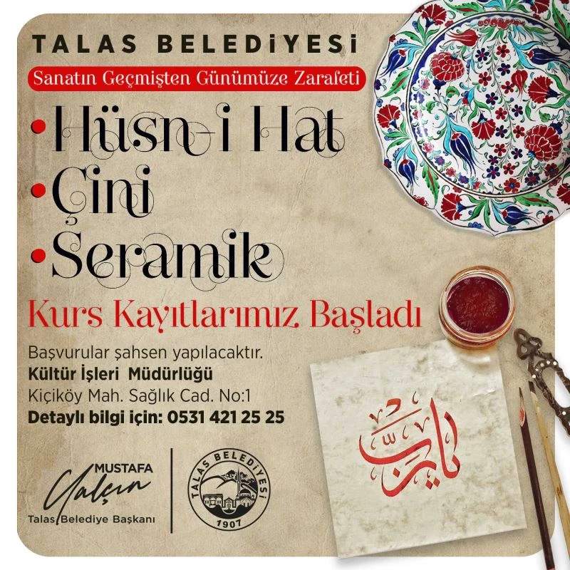 Talas Belediyesi, geçmişten bugüne sanatın zarafetini yaşamak isteyenlere yönelik hüsn-i hat, çini ve seramik kursları düzenledi.