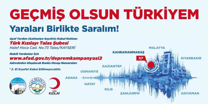 ‘Yaraları Birlikte Sarıyoruz’ adıyla başlatılan, Talas Kaymakamlığı ve Türk Kızılay Talas Şubesi ile birlikte yürütülen kampanya için aynî yardım kabul noktası oluşturuldu. Türk Kızılay Talas Şubesi’nin yeni açılan Halef Hoca Caddesi No:73’teki hizmet binasında toplanan battaniye ve kıyafetler, koordineli şekilde deprem bölgesine gönderilecek. Yetkililer, ikinci el kıyafet kabul edilmeyeceğine dikkat çekerek, yardımseverlere kullanılmış kıyafet getirilmemesi uyarısında bulundu.