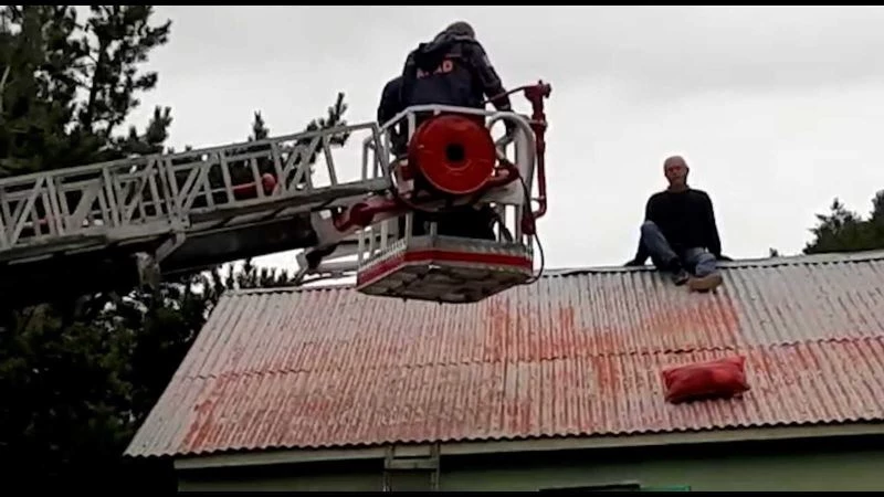Gümüşhane’de tamir etmek için evinin çatısına çıkan vatandaş yükseklik korkusu tutunca aşağı inemedi. Çatıda kalan vatandaş bölgeye çağrılan İtfaiye aracının sepetiyle kurtarıldı.