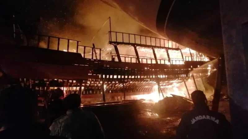 Tamirattaki 26 metrelik tur teknesi alev alev yandı