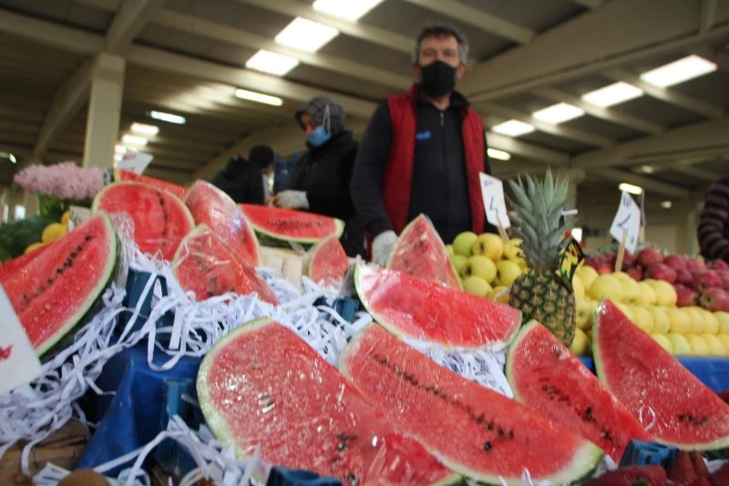Sezonun ilk karpuzu pazar tezgahına yüksek fiyatla girdi. Kilosu 8 liradan satılan, tanesi ortalama 60 ile 80 TL’yi bulan karpuz, tüketicinin isteği üzerine çeyrek dilimlerle satılmaya başlandı.