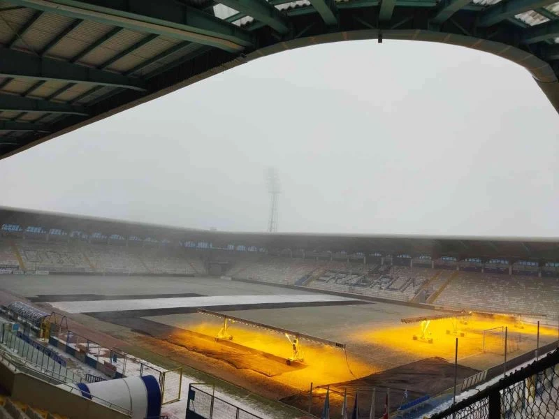 Bu arada Stat personeli de saha zeminin soğuktan etkilenmemesi ve müsabaka saatine kadar saha zeminin tazeliğini koruması için yoğun bir çalışma örneği sergiliyor.
