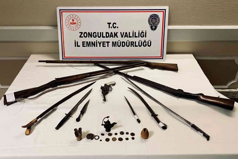 Edinilen bilgiye göre Zonguldak İl Emniyet Müdürlüğü KOM Şube Müdürlüğü tarafından Ş.C. isimli şahsın tarihi eser niteliği taşıyan ürünleri ikametinde ve iş yerinde bulundurduğuna yönelik istihbari bilgiler elde edilmesi üzerine harekete geçti. Ekipler Ş.C. isimli şahsın ikametinde ve iş yerinde yapılan aramada, 3 adet tüfek, 1 adet tarihi toplu tabanca, 12 adet sikke, 4 adet tarihi obje, 4 adet kama ,3 adet kılıç, 2 adet tabanca fişeği (9 mm - 7.65 mmm, 9 adet 16 Cal. av tüfeği fişeği ele geçirildi. Ekipler tarafından gözaltına alınan Ş.C. isimli şahıs hakkında adli işlem başlatıldı.