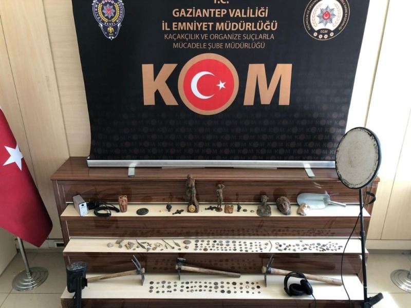 Gaziantep Emniyet Müdürlüğü Şahinbey Kaçakçılık ve Organize Suçlarla Mücadele ekipleri yol kontrolleri sırasında durduğu bir araçta tarihi eserlerin olduğunu fark etti. Ekipler araç içerisinde yaptıkları aramada çok sayıda tarih eser ve kazı malzemesi ele geçirdi. Araç içerisinde bulunan 120 adet sikke, 9 adet yüzük, 3 adet haç, 4 adet kolye ucu ve bir adet zincir, 9 adet heykel, 1 adet madalyon, 6 adet misket, 55 adet değişik ebat ve boyutlarda eşya, 3 adet taş ve 2 adet dedektör ele geçirdi. Ekipler, olayla ilgili olarak yakalanan şüpheli şahıs hakkında ise işlemlere başladı.