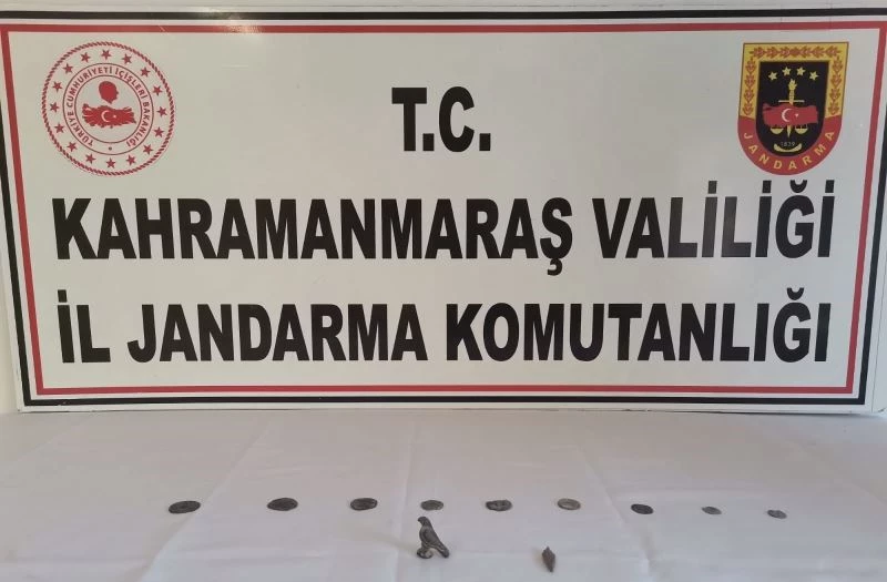 Kahramanmaraş’ta jandarmanın düzenlediği operasyonda bir şahsın satmak için müşteri aradığı Roma ve Bizans dönemine ait heykelcik ve sikkelerden oluşan 11 adet tarihi eser ele geçirildi.