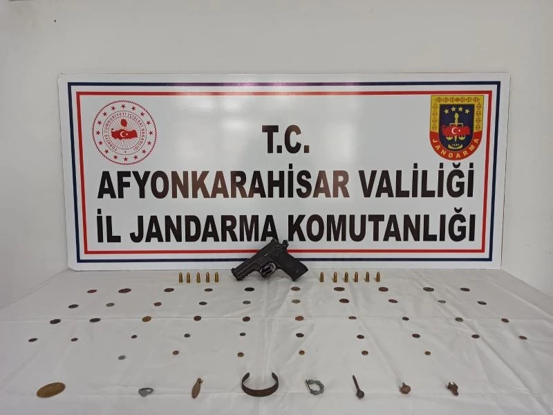 Afyonkarahisar İl Jandarma Komutanlığı ekipleri Bolvadin ilçesinde ikamet eden M.A., isimli şahsın elinde tarihi eser niteliği taşıyan kandil ve sikkelerin bulunduğunu tespit etti. Bu eşyaları satmaya çalıştığı ihbarını alan jandarma ekipleri Bolvadin-Kemerkaya köyü yol üzerinde şüpheli aracı durdurarak araç içerisindeki M.A. ve A.D., isimli şahısların üzerlerinde arama yaptı. Yapılan aramalarda 1 adet ruhsatsız tabanca ile tarihi eser olduğu değerlendirilen 1 adet kolye ucu, 1 adet bileklik, 1 adet yüzük, 51 sikke ve obje ele geçirildi.