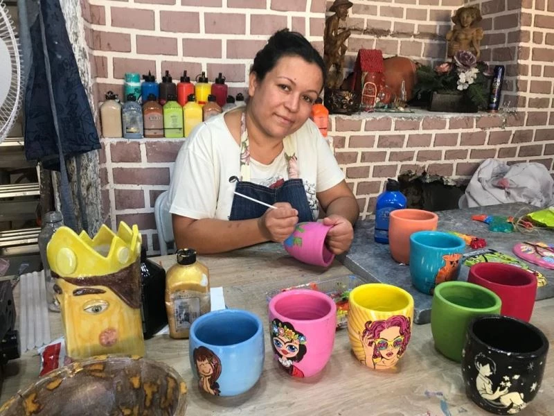 Buldan ilçesi Hamamboğazı sokağında bulunan ve adeta viraneye dönen tarihi fırını restore eden öğretmen Pınar Başar, estetik görünüme kavuşturdu. İçerisinde çamuru işleyerek saksı, bardak ve süs eşyaları tarzında işlemeler yapan öğretmen, esşyaları geri dönüşüme uygun hale getirerek ekonomiye katkıda bulunuyor. ‘Pınar Başar Hepsi Sanat’ adını verdiği sanat atölyesini Buldan’a kazandıran öğretmen, sanatın ilerlemesini istiyor.