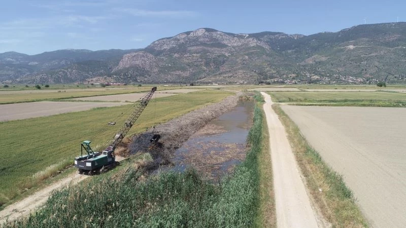 Aydın’ın Söke ilçesinde Devlet Su İşleri (DSİ) 21. Bölge Müdürlüğü tarafından D12 drenaj kanalında tarım arazilerini taşkınlardan koruyacak olan yatak temizlik çalışması sürüyor.