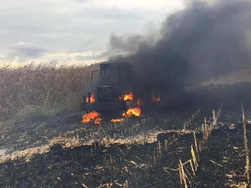 Tarlada mısır hasadında yanan traktör kullanılamaz hale geldi