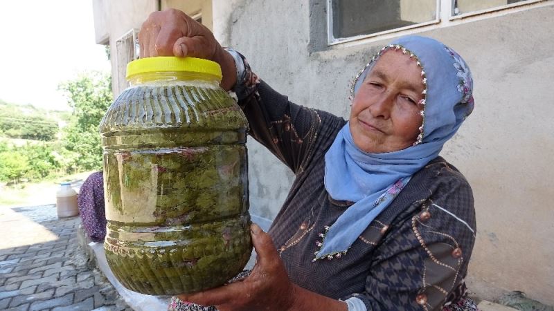 Büyükyıldız Köyünde imece usulü bağ yaprağı toplayarak salamura yapan 68 yaşındaki Belgis Tuna, meşhur Tokat bağ yaprağının yoğun ilgi gördüğünü kaydetti. Bağlardan toplanan bağ yapraklarının desteklendikten sonra haşlanarak salamuraya hazır hale getirildiğini belirten Tuna, tuzlu suda haşlanan bağ yaprağının bidonlara konulduğunu söyledi. İmece usulü olarak salamura bağ yaprağı işinin günlerini aldığını belirten Tuna, “Önceden daha yoğun oluyorduk. En az 20-30 kiloluk bidonlara bağ yaprağı basıyorduk. 40-50 bidon yapıyorduk. Bağlarımız kuruduğu için biraz daha azaldı işimiz” dedi.
