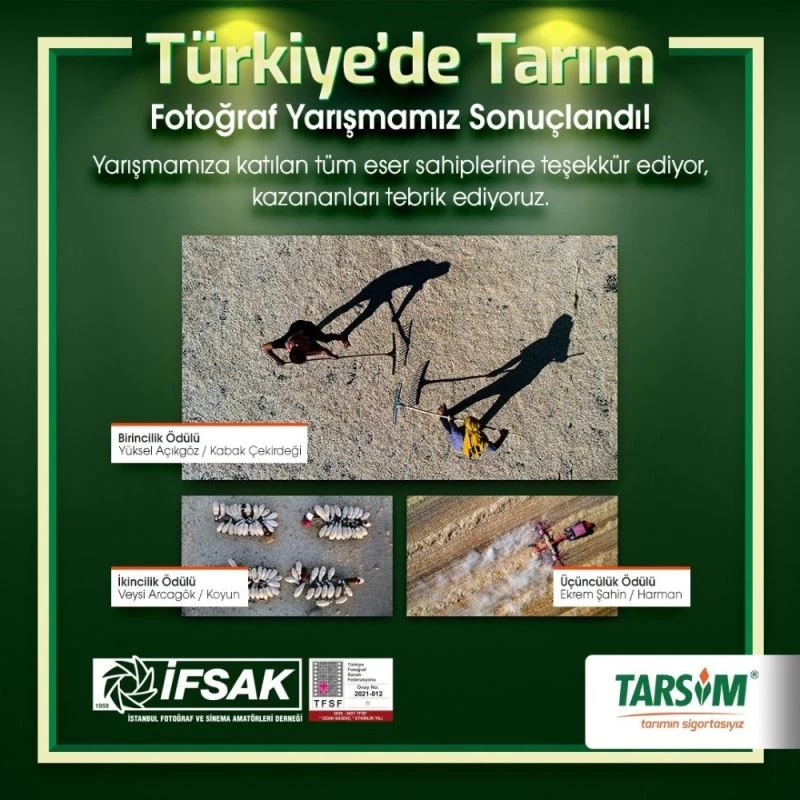 Tarım Sigortaları Havuzu (TARSİM) tarafından, İstanbul Fotoğraf ve Sinema Amatörleri Derneği (İFSAK) ve Türkiye Fotoğraf Sanatı Federasyonu (TFSF) ile birlikte düzenlenen “Türkiye’de Tarım” başlıklı Fotoğraf Yarışması sonuçlandı.