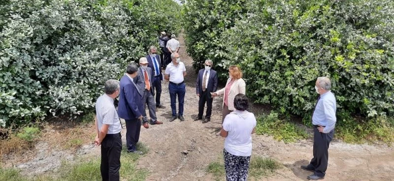 Proje ekibinde yer alan Tarım ve Orman Bakanlığı Tarım Reformu Genel Müdür Yardımcısı ve TARSİM Yönetim Kurulu Üyesi Bekir Engürülü, Tarım Sigortaları ve Doğal Afetler Daire Başkanı Kamil Özdemir ve Mühendis Ahmet Savaş İntişah, TARSİM Yönetim Kurulu Üyesi ve Tarım Sigortaları Havuz İşletmesi Genel Müdürü Serpil Günal, Genel Müdür Yardımcısı Tufan Özel, Bitkisel Ürün Sigortaları Grup Müdürü Ertuğrul Çelik, AR-GE Birimi Müdür Yardımcısı Dr. Erol Yalçınkaya, Çukurova Üniversitesi Ziraat Fakültesi Bahçe Bitkileri Bölümü’nden Prof. Dr. Turgut Yeşiloğlu, Batı Akdeniz Tarımsal Araştırma Enstitüsü’nden Dr. Ertuğrul Turgutoğlu ve Alata Bahçe Kültürleri Araştırma Enstitüsü’nden Dr. Güçer Kafa ile Enstitü Müdürü Doç. Dr. Davut Keleş bahçede incelemeler yaparak, Başkan Karabucak ile karşılıklı görüş alışverişinde bulundu.