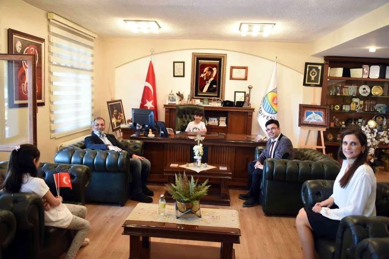 Lütfiye Benli İlkokulu 2-A sınıfından Medine Konu ve Bayram Demir, 23 Nisan kutlamaları çerçevesinde öğretmenleri ile Tarsus Belediye Başkanı Haluk Bozdoğan’ı ziyaret etti. Başkan Bozdoğan, öğrencilerle sohbet ederek belediyenin çalışmaları hakkında bilgilendirdi.