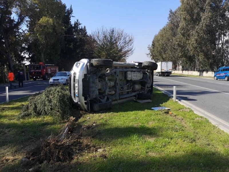 Kaza, ilçeye bağlı D-400 Karayolu Yenice Mahallesi’nde meydana geldi. Mersin Büyükşehir Belediyesi Park ve Bahçeler Daire Başkanlığı Tarsus Şube Müdürlüğü personeli Mehmet Ö. idaresindeki 34 CTD 702 plakalı pikap, direksiyon hakimiyetinin kaybolması sonucu refüjdeki ağaca çarparak yan yattı. Aracın şoförü Mehmet Ö., araçta bulunan Vakıf S. ve Elçin G. yaralandı. Olay yerine çağrılan 112 acil Servis ekipleri ile yaralılar Tarsus Devlet Hastanesine kaldırıldı. Yaralıların sağlık durumlarının iyi olduğu öğrenildi.