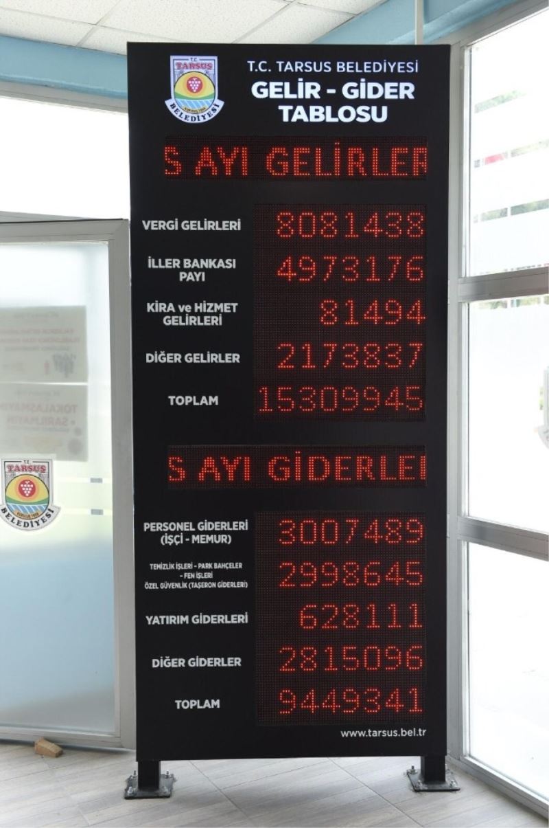 Tarsus Belediyesinden yapılan açıklamaya göre, Belediye Başkanı Haluk Bozdoğan, göreve gelmesinin ardından şeffaf belediyecilik anlayışı çerçevesinde, belediye harcamaları ve gelirleriyle ilgili bilgi sahibi olmak isteyen vatandaşlara kolaylık sağlamak için gelir gider bilgilerini gösteren dijital panonun belediye binasının girişine yerleştirilmesini sağladı.