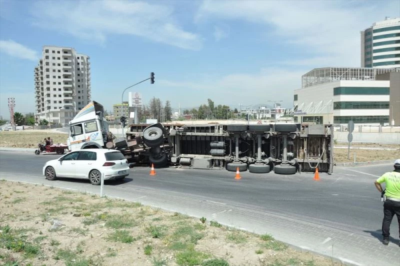 MERSİN - Mersin’in Tarsus ilçesinde konteyner yüklü tır devrildi.