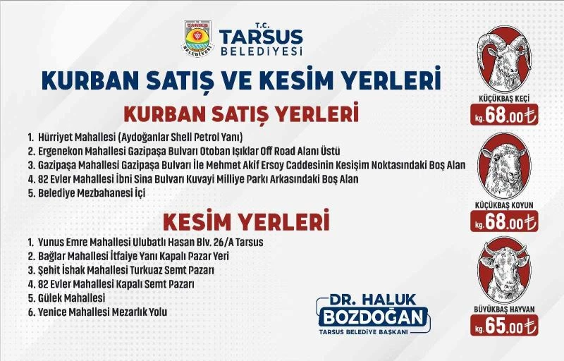 Buna göre Tarsus’taki kurbanlık satış yerleri; Hürriyet Mahallesi (Aydoğanlar Shell Petrol Yanı) Ergenekon Mahallesi Gazipaşa Bulvarı otoban ışıklar Off Road alanı üstü, Gazipaşa Mahallesi Gazipaşa Bulvarı ile Mehmet Akif Ersoy Caddesinin kesişim noktasındaki boş alan, 82 Evler Mahallesi İbni Sina Bulvarı Kuvayı Milliye Parkı arkasındaki boş alan ve Belediye Mezbahanesi içi olarak açıklandı.