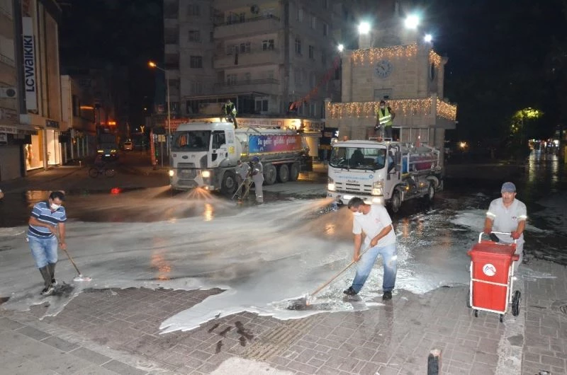 Bu kapsamda Tarsus ilçesinde Atatürk Caddesi’nin PTT ana binası ile Halk Eğitim Merkezi bölümünün trafiğe kapatılmasıyla oluşan Yarenlik Alanında, Büyükşehir Belediyesi Tarsus-Çamlıyayla Şube Müdürlüğü ekipleri, baştan sona ilaçlı sularla yıkama ve dezenfekte çalışması yaptı. Her gün binlerce kişinin geçiş yaptığı alan üzerinde gece saatlerinde onlarca personel, 2 arazöz ve süpürge makinaları da kullanılarak yapılan çalışmada fırçalarla tüm noktalar temizlendi.