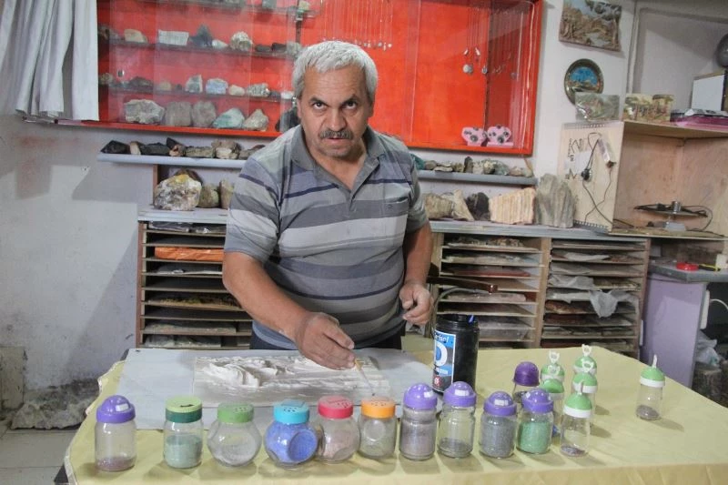 Denizli’de sanatçı Şenol Akkuş, yaptığı tablolarda boya yerine, doğadan topladığı renkli taşların tozunu kullanıyor.