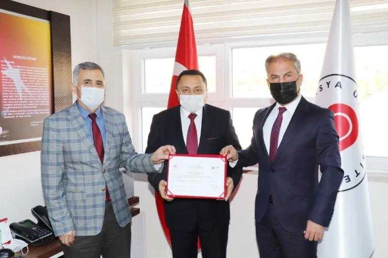 Rektör Yardımcısı Prof. Dr. Recep Kürkçü ile Sıfır Atık Komisyon Başkanı Çetin Alpaslan, Taşova Yüksel Akın Meslek Yüksekokulu Müdürü Doç. Dr. Murat Kurt’a Temel Seviye Sıfır Atık Yetki Belgesini teslim etti.