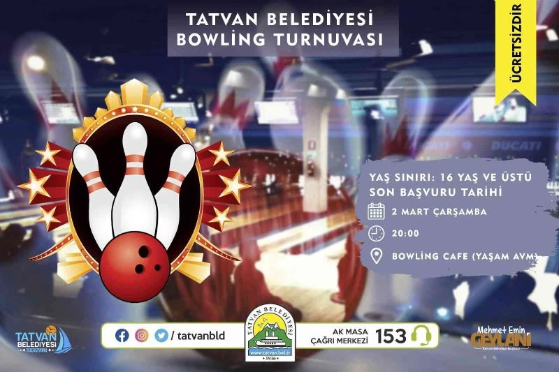 Sosyal belediyecilik alanında bölgenin önde gelen belediyesi olan Tatvan Belediyesi, kültür sanat etkinliklerinin yanı sıra spor dalında da etkinlikler düzenliyor. Tatvan Yaşam AVM yönetimi ile ortaklaşa düzenlenen bowling turnuvası için 16 yaş ve üzeri vatandaşların başvuru yapabileceği belirtildi. Bowling turnuvasına katılacak yarışmacıların 2 Mart Çarşamba günü saat 20.00’ye kadar Tatvan Yaşam AVM Bowling Kafe’de kayıt yaptırmaları gerektiği kaydedildi.