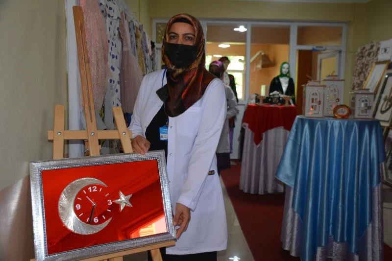 Sergide, Aile Destek Merkezi’nin 8 kursuna katılan 120 kursiyer, Kültür Sanat Merkezi’nin 7 kursuna katılan 100 kursiyer ve Halk Eğitim Merkezi kurslarına katılan kursiyerler tarafından hazırlanan çok sayıda el işi ve el sanatları ürünleri yer alıyor.
