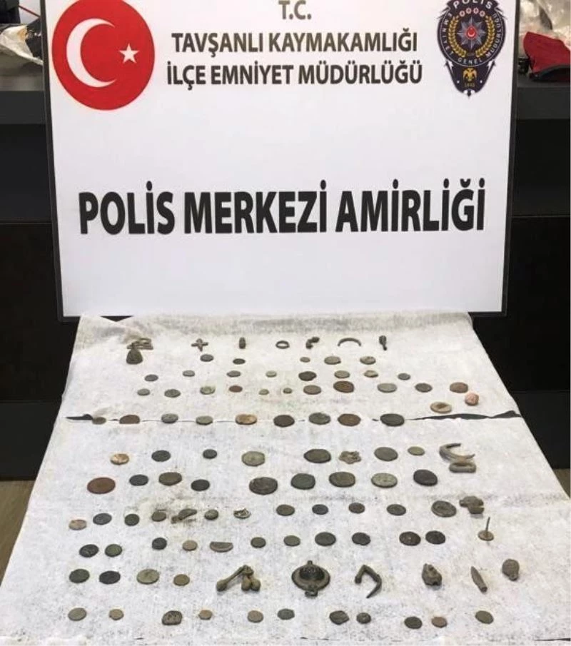 Kütahya’nın Tavşanlı ilçesinde durdurulan bir araçta yapılan aramada 153 parça tarihi eser olduğu değerlendirilen obje ve sikke ele geçirildi.