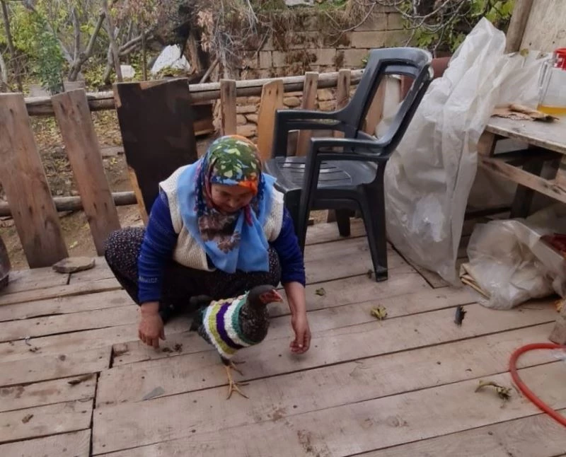 Kahramanmaraş’ta bir kadın, soğuk havada üşümesin diye tavuklarına kazak ördü.