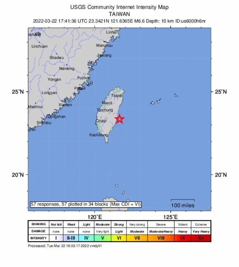 ABD Jeolojik Araştırma Merkezi (USGS), Tayvan açıklarında 6.6 büyüklüğünde deprem meydana geldiğini bildirdi.