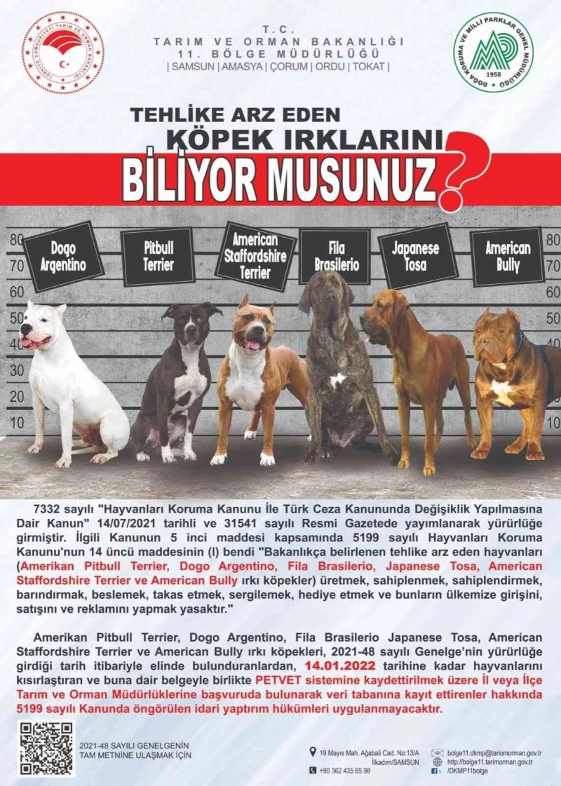 Tarım ve Orman Bakanlığı tarafından Amerikan pitbull terrier, dogo Argentino, fila Brasilerio, Japanese tosa, American staffordshire terrier ve American bully ırkı köpeklerin tehlike arz eden hayvanlar olarak belirlendiği hatırlatılan açıklamada, 5199 sayılı Hayvanları Koruma Kanun’u kapsamında bu ırkları üretmek, sahiplenmek, sahiplendirmek, barındırmak, beslemek, takas etmek, sergilemek, hediye etmek ve bunların ülkeye girişini, satışını ve reklamını yapmanın yasak olduğu belirtildi.